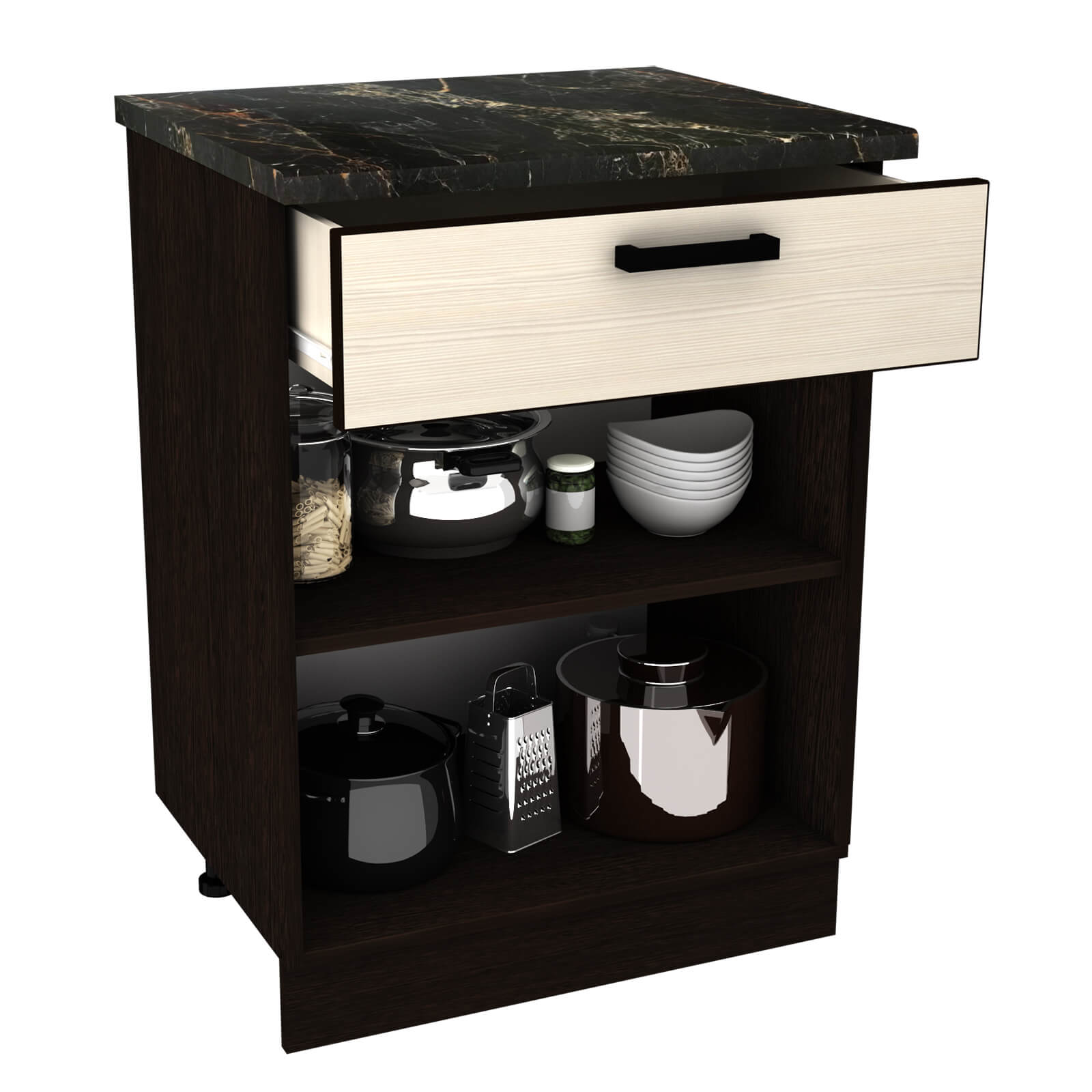 Стол оснащен ящиком-тумбой, что позволяет удобно хранить кухонные принадлежности и аксессуары.