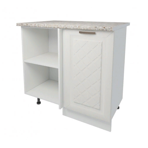 Мебель выполнена из ЛДСП и МДФ, а выдвижные ящики укомплектованы роликовыми направляющими. Опоры регулируются по высоте и закрыты цоколем.