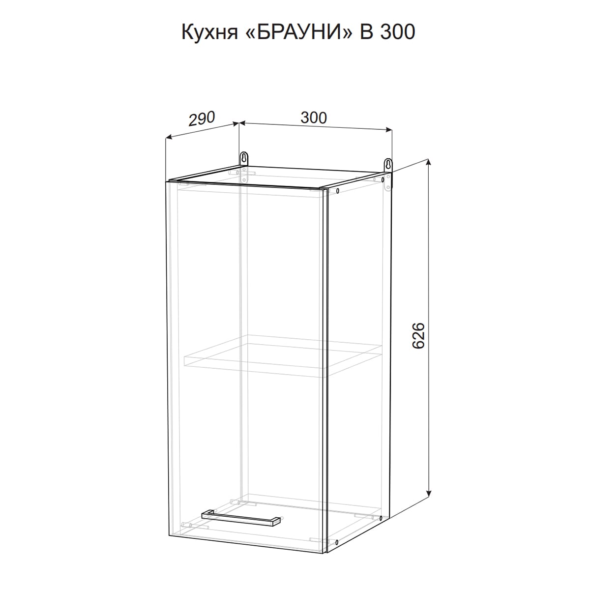 Шкаф имеет размеры 626 мм в высоту, 300 мм в ширину и 290 мм в глубину, что позволяет разместить в нем достаточное количество посуды и кухонных принадлежностей. Конструкция шкафа включает в себя одну распашную дверь и секцию с полкой, что обеспечивает удобное хранение и легкий доступ к содержимому.