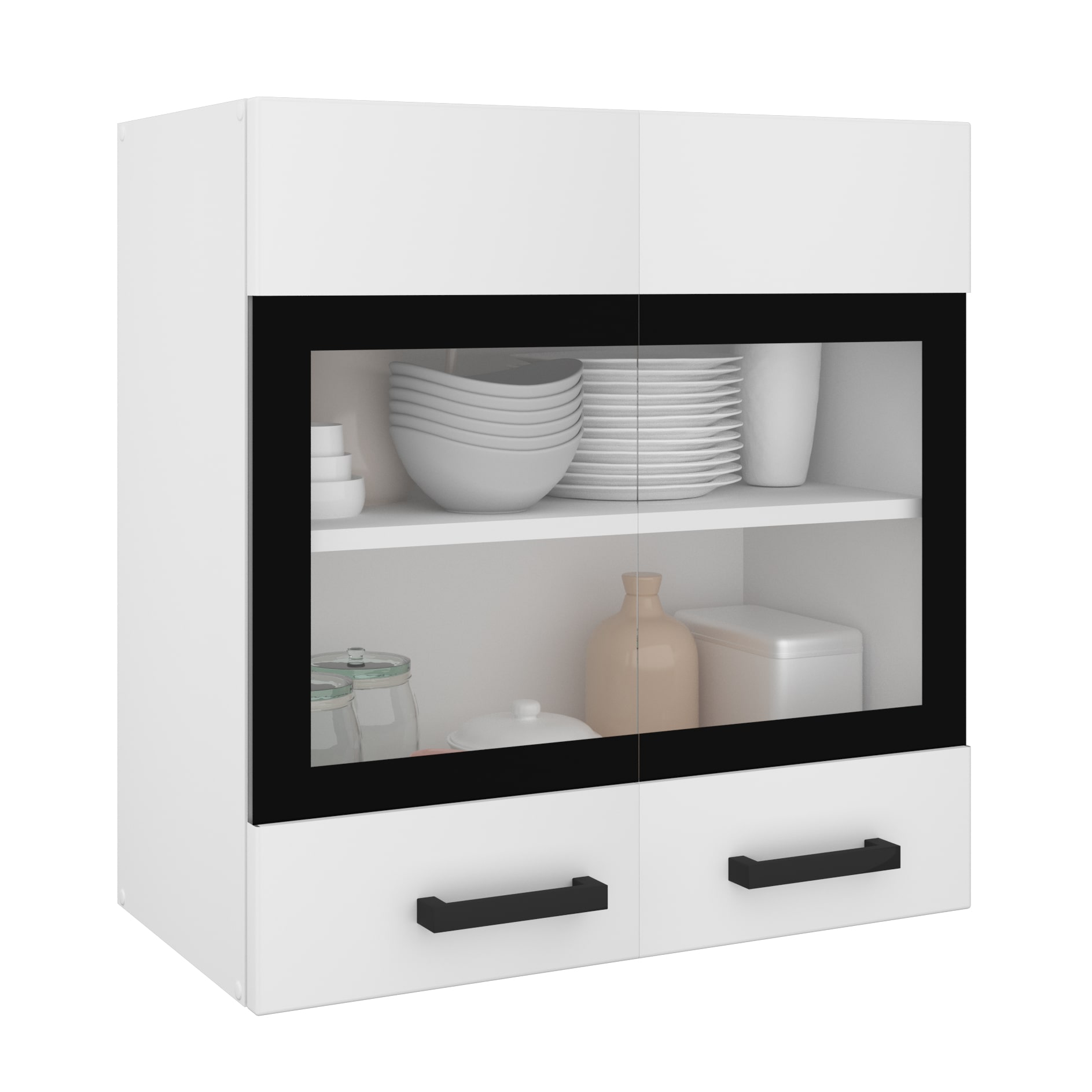 Материал корпуса и фасада шкафа – ЛДСП, что обеспечивает его прочность и долговечность. Фасад выполнен из стекла, которое придает шкафу легкость и воздушность. Ручка изготовлена из черного пластика.