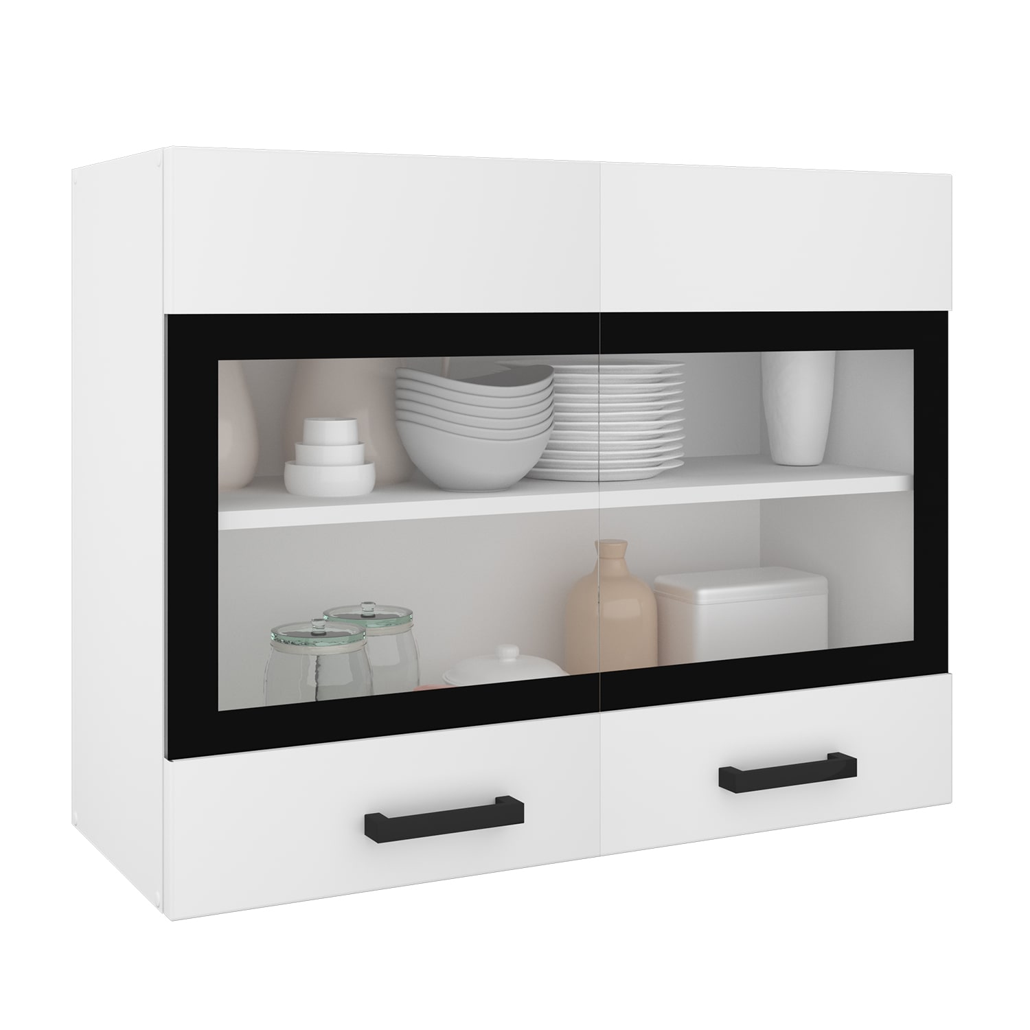 Шкаф оснащен двумя распашными дверями со стеклом. Это не только добавляет эстетики, но и обеспечивает хорошую видимость содержимого шкафа.