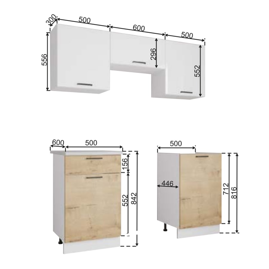 В комплект вхожит: кухонные модули, столешница, цоколь, фурнитура.