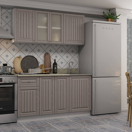 В комплект кухни входят: столешница, шкаф напольный с полками, шкаф напольный под мойку, шкаф напольный с ящиками, шкаф настенный, шкаф настенный под сушку, шкаф-витрина настенный. Материал корпуса - ЛДСП, материал фасада - МДФ/стекло, материал столешницы - ЛДСП, материал фурнитуры - металл. Толщина столешницы составляет 26 мм.