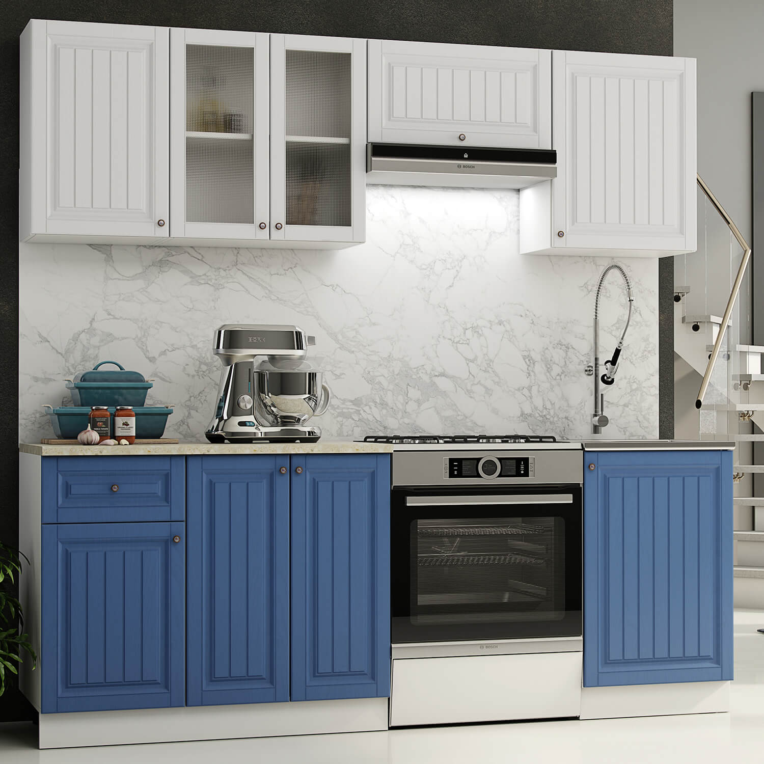 Кухня Хозяюшка 2,1 Акация Белая-Деним, материал корпуса - ЛДСП, габариты 2100x600x2100 мм.