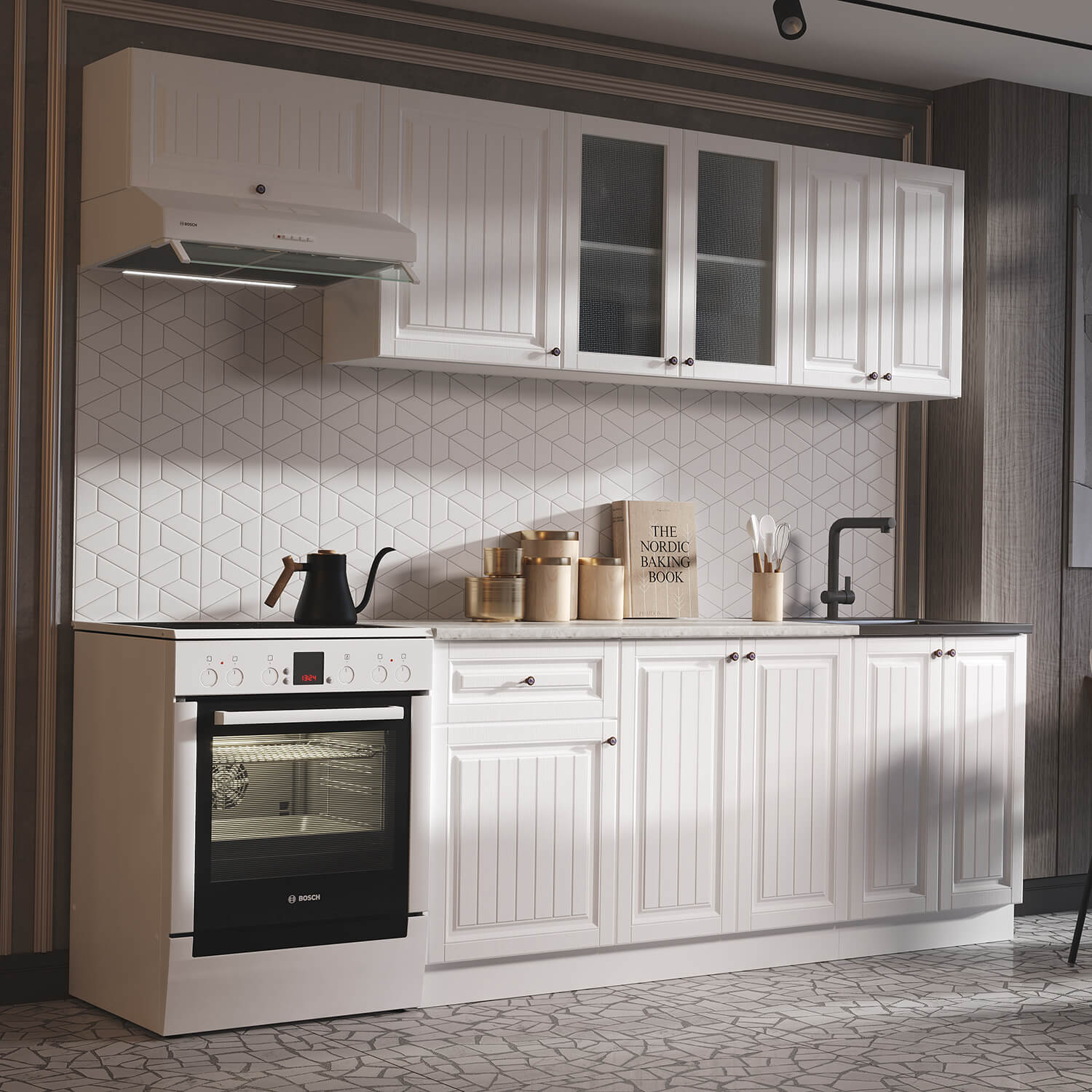 Кухня Хозяюшка 2,4 Акация Белая, материал корпуса - ЛДСП, габариты 2400x600x2100 мм.