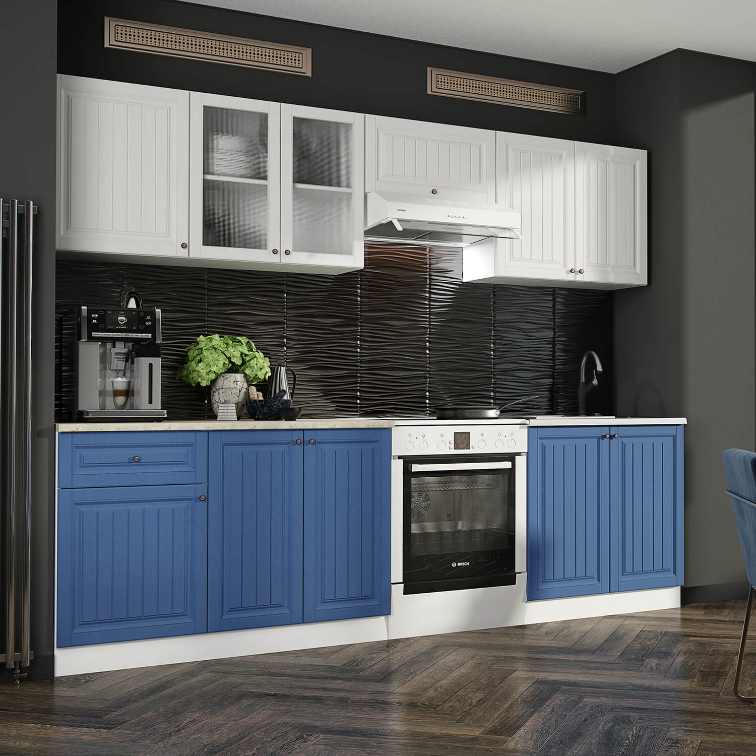 Кухня Хозяюшка 2,6 Акация Белая-Деним, материал корпуса - ЛДСП, габариты 2600x600x2100 мм.