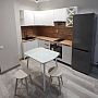 У нас не так много вариантов по проекту кухни, так как студия очень маленькая. Взяли стандартный вариант в белом цвете.