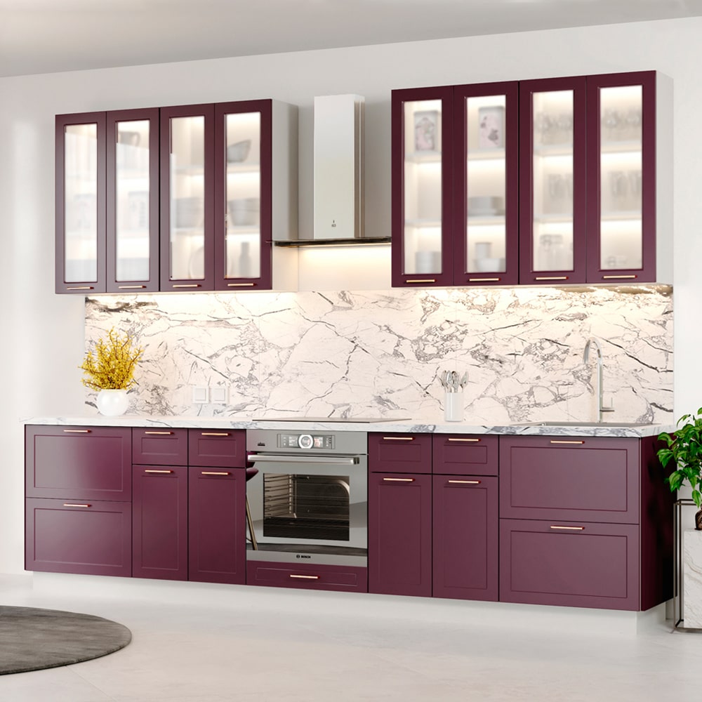 Недавно нам установили такую в цвете черника. Все детали продуманы, ящики легко выдвигаются. Все полочки удобно расположены. Понравилась столешница с небольшой текстурой. Моется отлично.