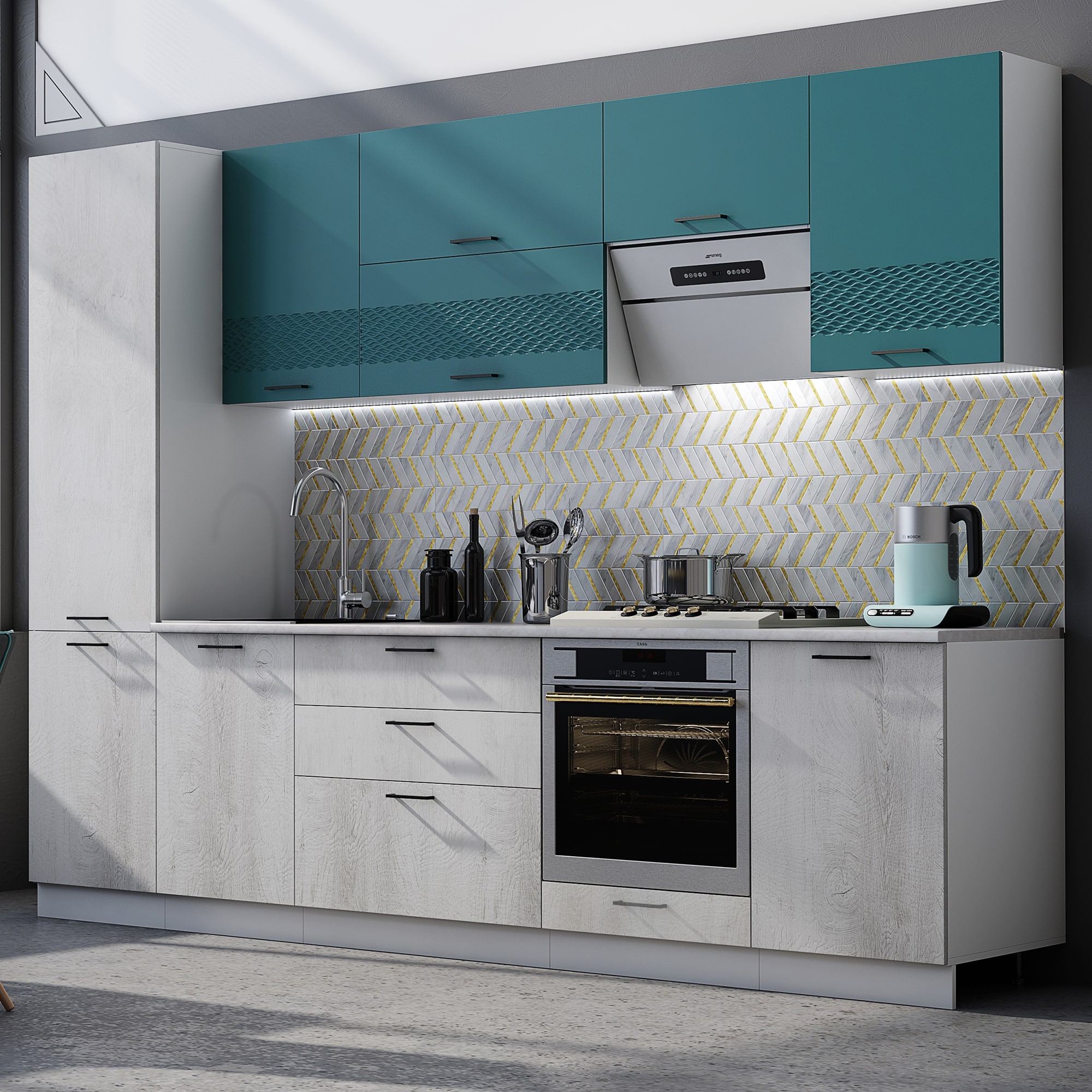 Кухня Лагуна 2900 Морская волна/Дуб седой доступна к заказу в различных цветовых исполнениях, подходящих к любому интерьеру обеденной зоны.