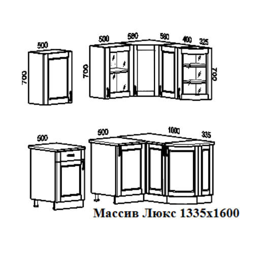 Кухня Массив угловая 1600х1335 правая, материал корпуса - ЛДСП, габариты 1600x1335x2100 мм.
