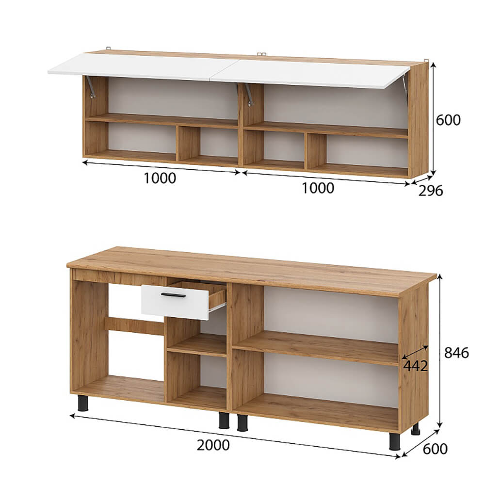 Кухня Монако 2,0 Дуб Золотой/Белый матовый/Дуб Вотан, материал корпуса - ЛДСП, габариты 2000x600x2046 мм. Материал фасада: МДФ, облицованный пленкой ПВХ