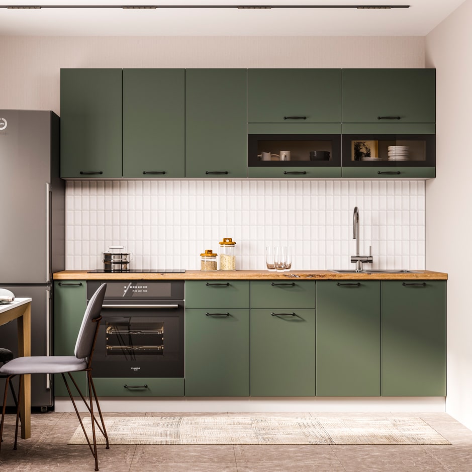 Кухонный гарнитур Ройс 2400 Оливково-зеленый доступна к заказу в различных цветовых исполнениях, подходящих к любому интерьеру обеденной зоны.