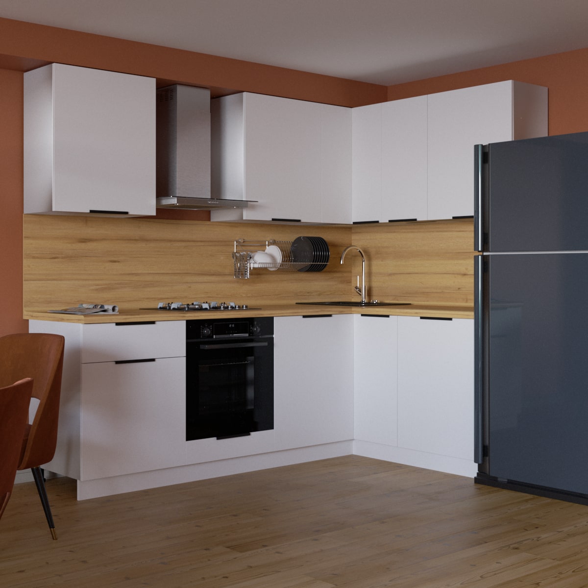 Угловая кухня “Сити” представляет собой идеальное сочетание элегантности и практичности. Она выполнена в современном стиле, что делает ее универсальной для любого интерьера и позволяет легко сочетать с другими элементами декора. Фасады кухни изготовлены из высококачественного МДФ, благодаря чему они обладают повышенной устойчивостью к повреждениям и легко чистятся. Контрастные черные ручки придают кухне гармоничное и стильное завершение.