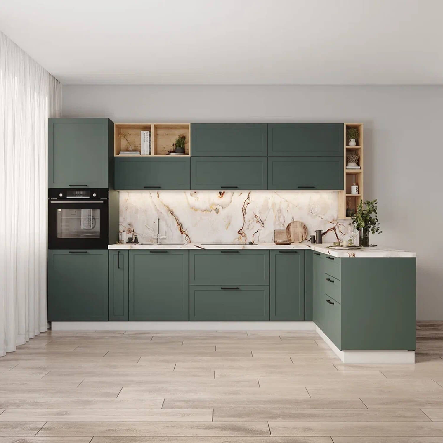 Кухонный гарнитур Перо 3200х1600 Аверса доступна к заказу в различных цветовых исполнениях, подходящих к любому интерьеру обеденной зоны.