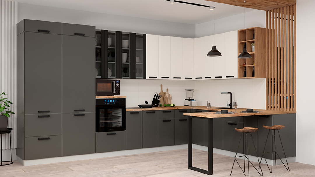 Кухонный гарнитур Ройс 3600х2500 Графит софт/Белый софт доступна к заказу в различных цветовых исполнениях, подходящих к любому интерьеру обеденной зоны.