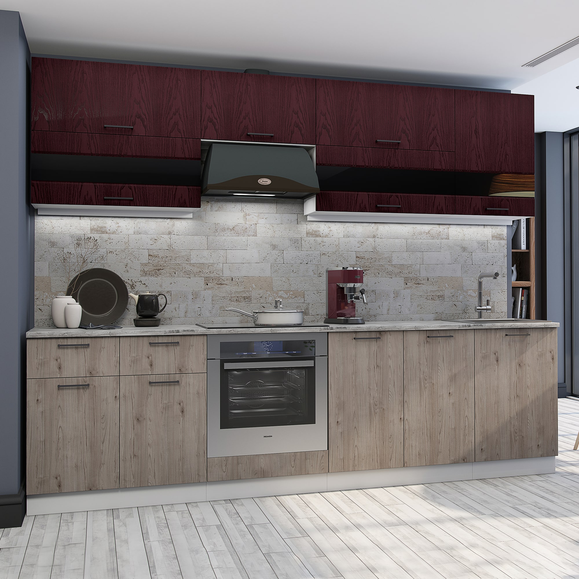 Кухня Астра 2700 Красное дерево/Дуб галиано доступна к заказу в различных цветовых исполнениях, подходящих к любому интерьеру обеденной зоны.