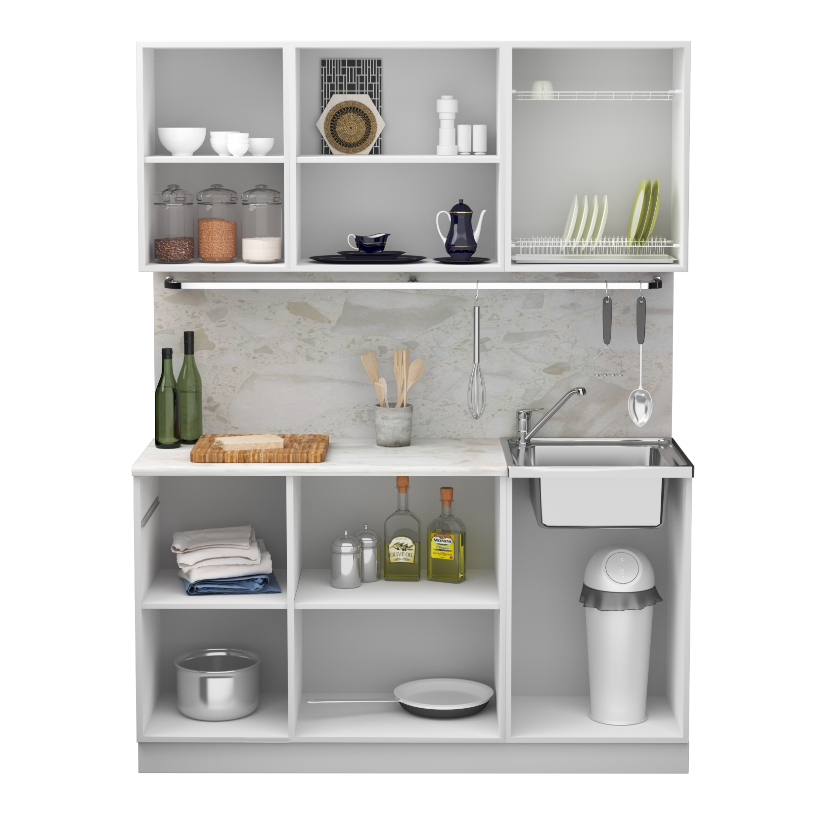 В комплект кухни входят: столешница, шкаф напольный с полками, шкаф напольный под мойку, шкаф напольный с ящиками, шкаф настенный, шкаф настенный под сушку, шкаф-витрина настенный. Материал корпуса - ЛДСП, материал фасада - МДФ/стекло, материал столешницы - ЛДСП, материал фурнитуры - металл. Толщина столешницы составляет 26 мм.