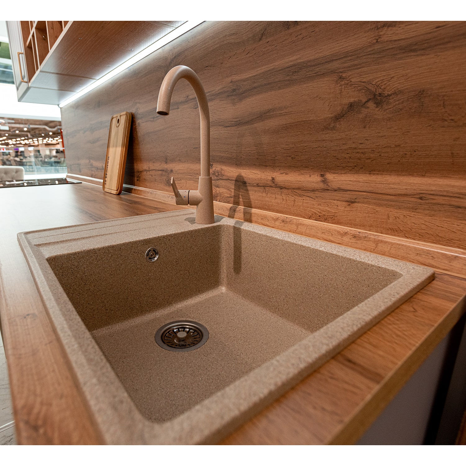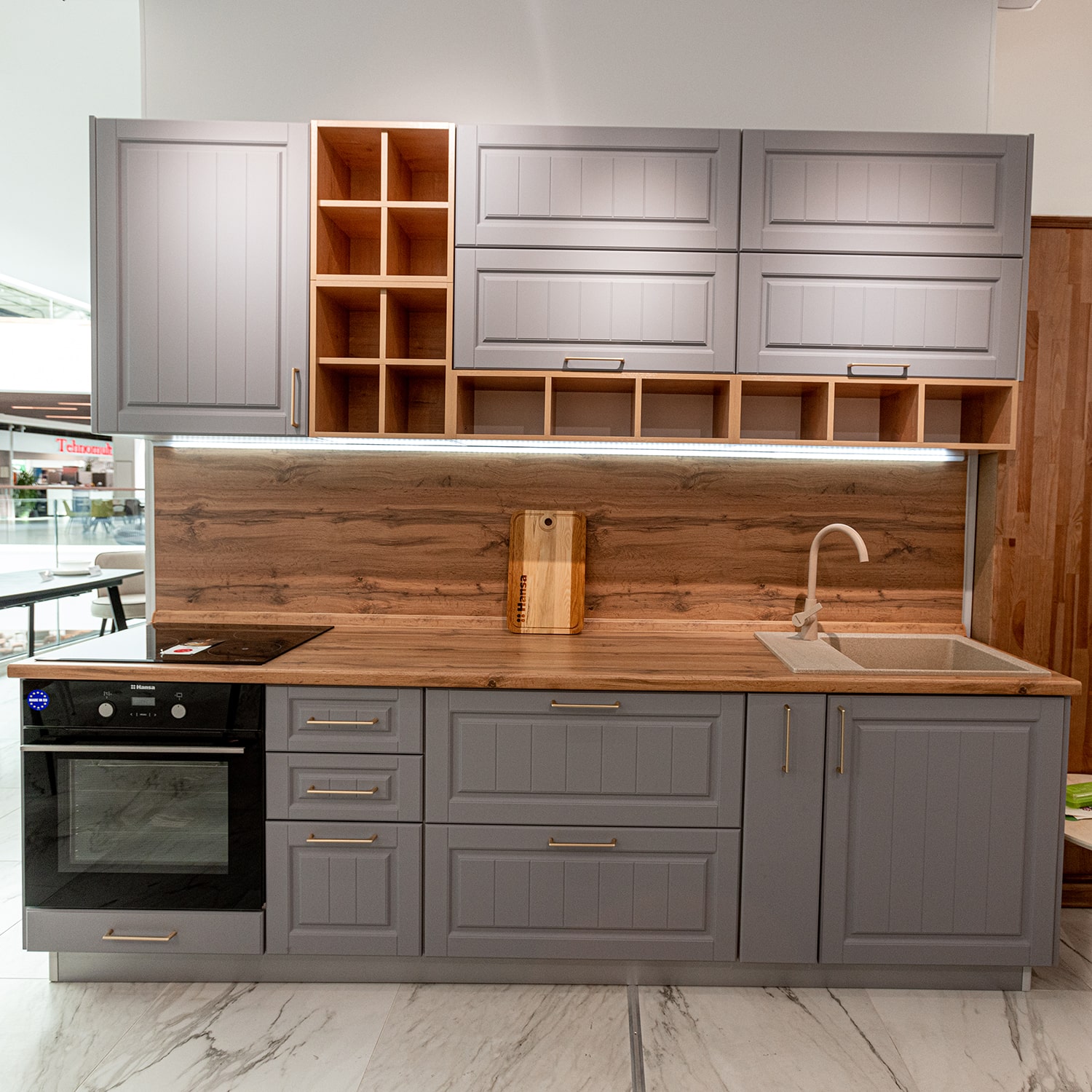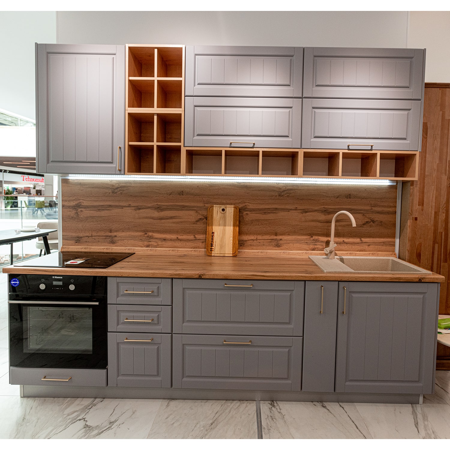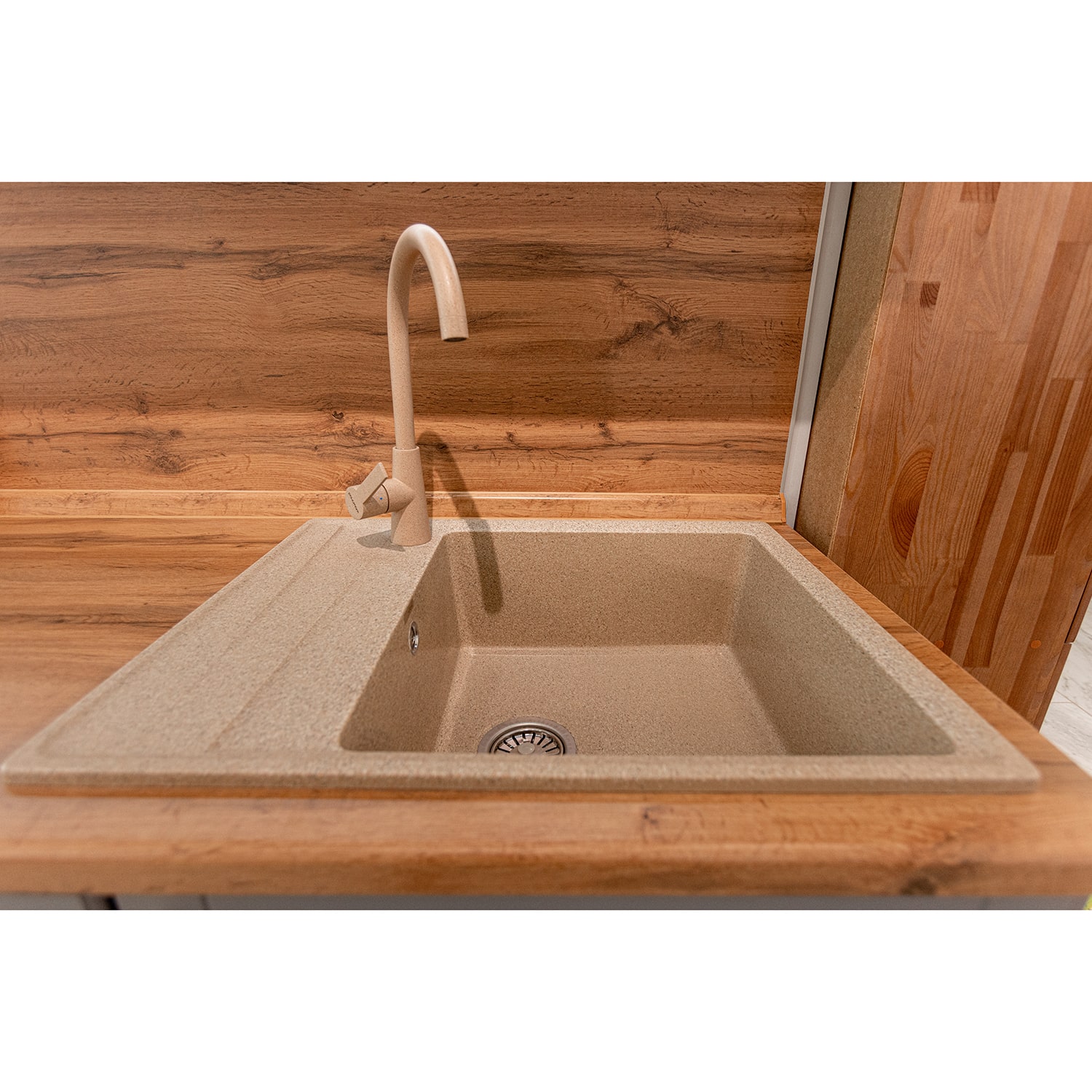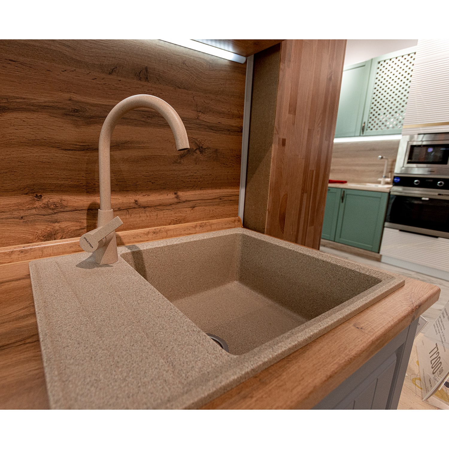 В комплект входит: верхние и нижние модули, столешница 38 мм (Дуб вотан), стеновая панель, Мойка кухонная Granfest GF - LV-660L, 660х500x200мм (искусственный камень, цвет песочный), смеситель для кухни высокий в цвет мойки Paulmark Ho212065 (цвет песочный), сушилка для посуды, подсветка.