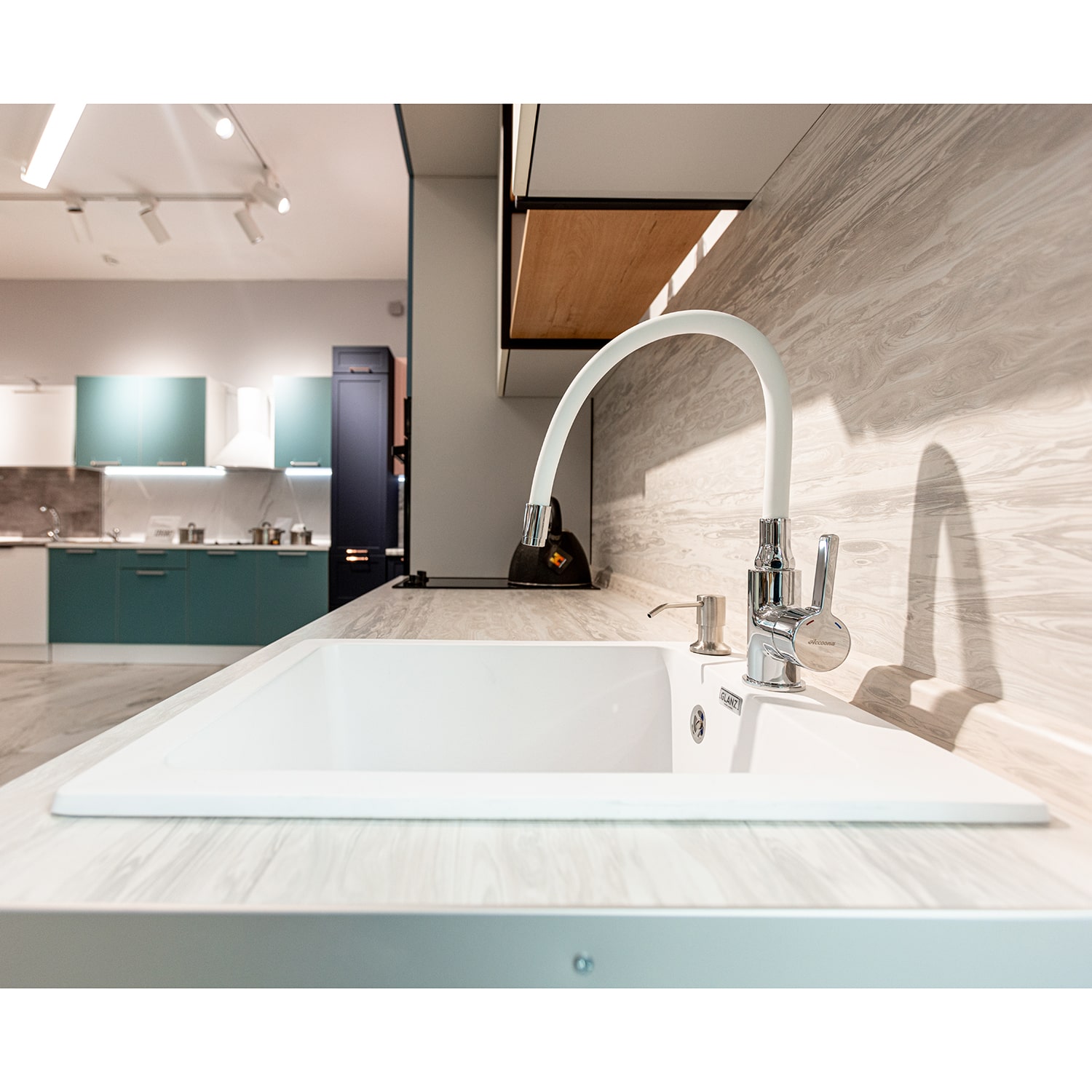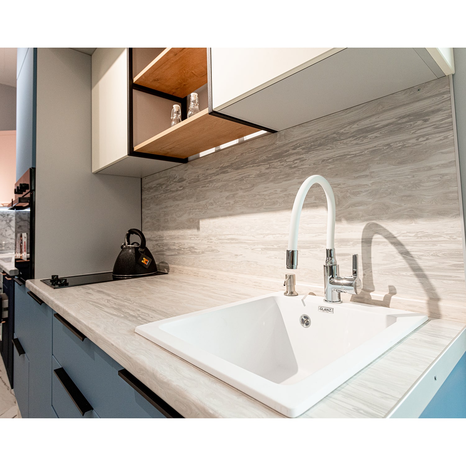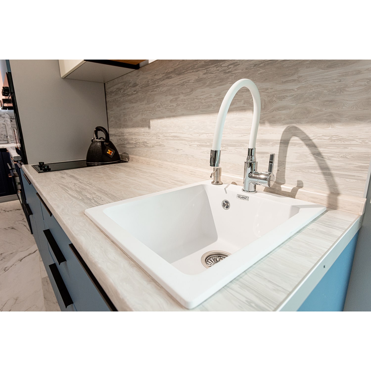 В комплект входит: верхние и нижние модули, столешница 38 мм (Олива жемчужная), стеновая панель, кухонная мойка GLANZ J8, смеситель, дозатор, мусорное ведро, сушилка для посуды.