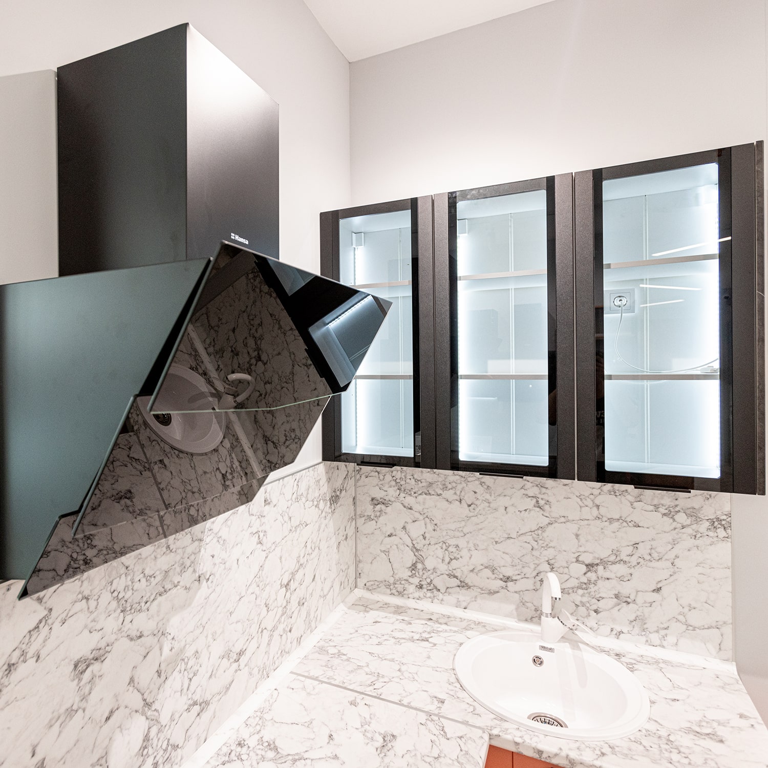 В комплект входит: верхние и нижние модули, столешница 38 мм (Белый мрамор), стеновая панель, кухонная мойка глянцевая BERGG Z6 (цвет - Белый лед), смеситель глянцевый BERGG MG009, подсветка.