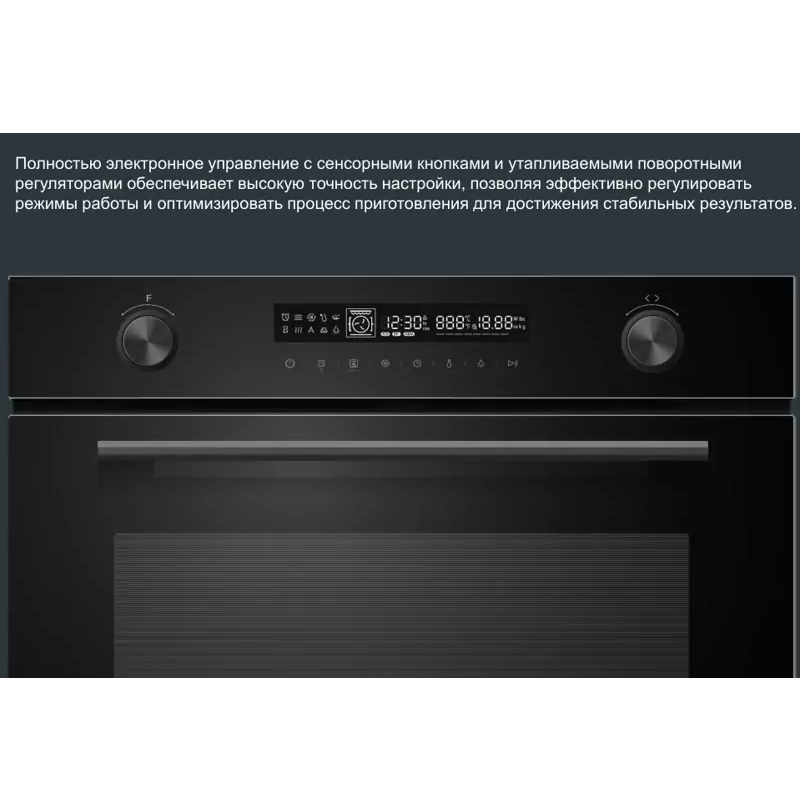 Современный интерфейс с сенсорными кнопками и четким LED-экраном делает настройку духового шкафа простой и интуитивно понятной. Все параметры отображаются на дисплее, а управление требует всего нескольких легких касаний.