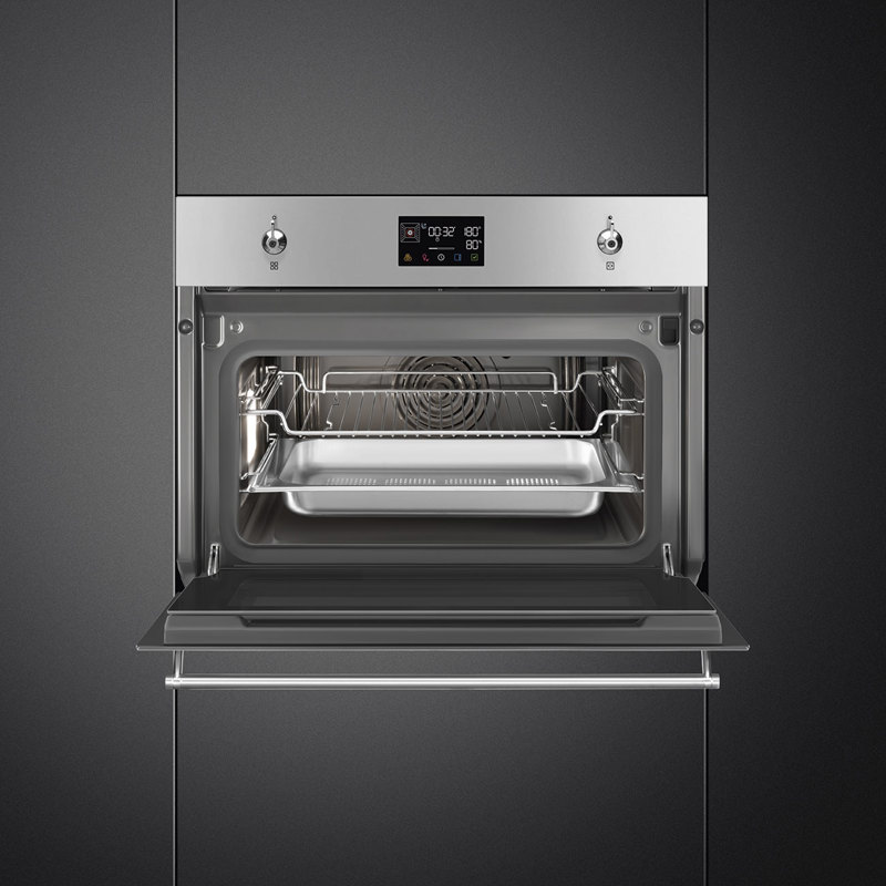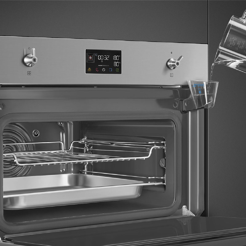 Духовой шкаф SMEG SO4302S3X предлагает двенадцать различных функций приготовления, что делает его универсальным помощником на любой кухне. Такое разнообразие функций позволяет готовить разнообразные блюда с максимальным удобством. Паровая система очистки значительно упрощает процесс ухода за устройством, используя пар для размягчения и удаления загрязнений. Это делает процесс очистки простым и эффективным, экономя время и усилия.