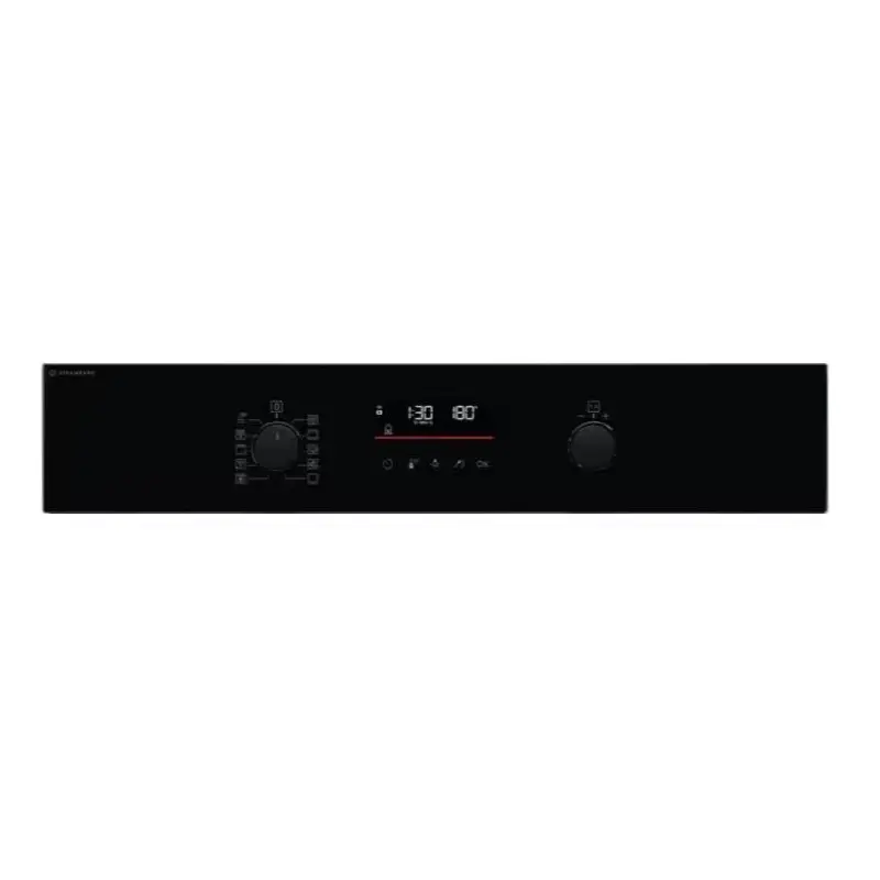 Духовой шкаф оснащен комбинированной системой управления: сенсорным дисплеем и поворотными утапливаемыми переключателями. Таймер дает возможность выбрать продолжительность приготовления — когда заданное время истечет, отключение произойдет автоматически. Галогенное освещение камеры позволяет следить за приготовлением без необходимости открывать дверцу и нарушать температурный режим.