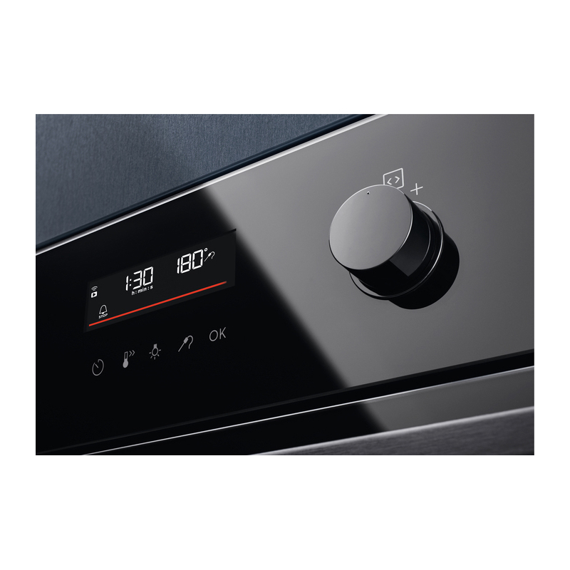 Духовой шкаф оснащен комбинированной системой управления: сенсорным дисплеем и поворотными утапливаемыми переключателями. Таймер дает возможность выбрать продолжительность приготовления — когда заданное время истечет, отключение произойдет автоматически. Галогенное освещение камеры позволяет следить за приготовлением без необходимости открывать дверцу и нарушать температурный режим.