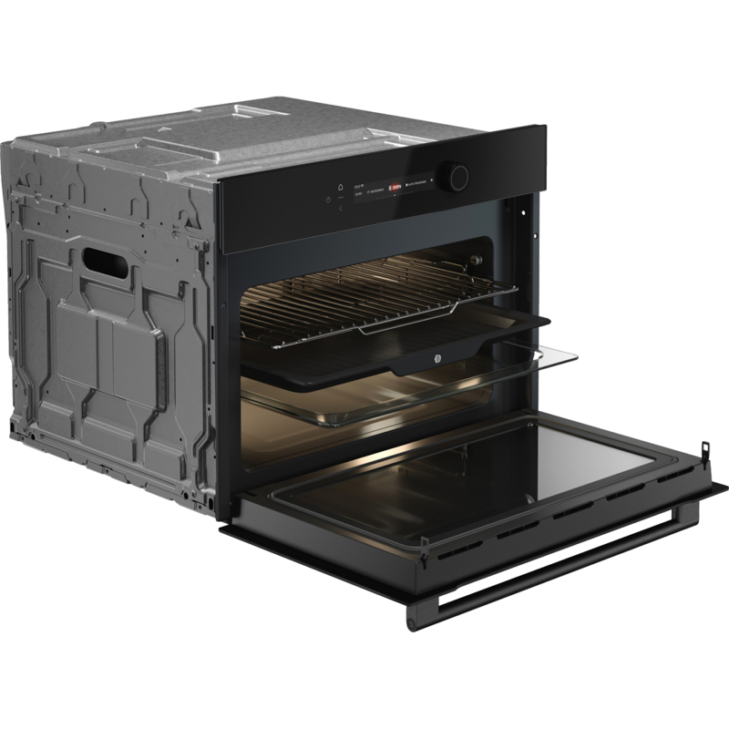 Управление духовым шкафом осуществляется через стильный TFT-дисплей с сенсорными кнопками и поворотным переключателем, что обеспечивает не только современный вид, но и максимальную простоту и точность контроля. 112 автоматических программ берут на себя все расчеты времени и температуры для различных продуктов, что идеально подходит для новичков и разгружает опытных поваров.