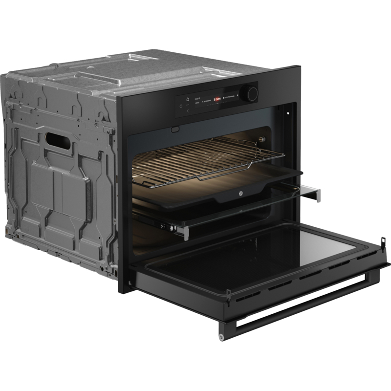 Среди особенностей конструкции — внутреннее LED освещение, которое равномерно подсвечивает рабочую камеру, облегчая наблюдение за ходом приготовления. Створка двери оборудована функцией плавного открывания и закрытия, что защищает мебель и снижает риск случайных повреждений. Для повышения комфорта предусмотрена система телескопических направляющих на одном уровне, позволяющая аккуратно извлекать противень без риска проливания содержимого.