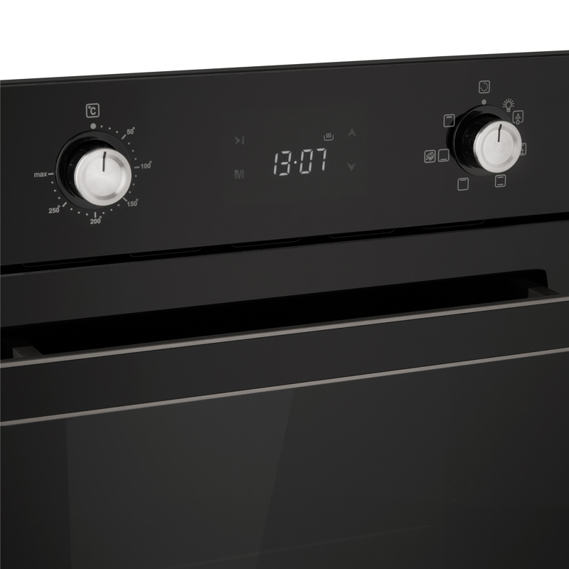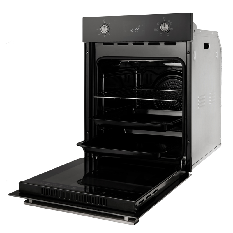 Модель оснащена двойным стеклом дверцы, которое снижает температуру на внешней поверхности и повышает безопасность. Защитное отключение при перегреве предохраняет устройство от поломок, а система вентиляции способствует равномерному распределению температуры и продлевает срок службы духовки.