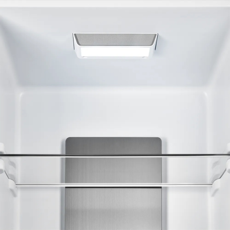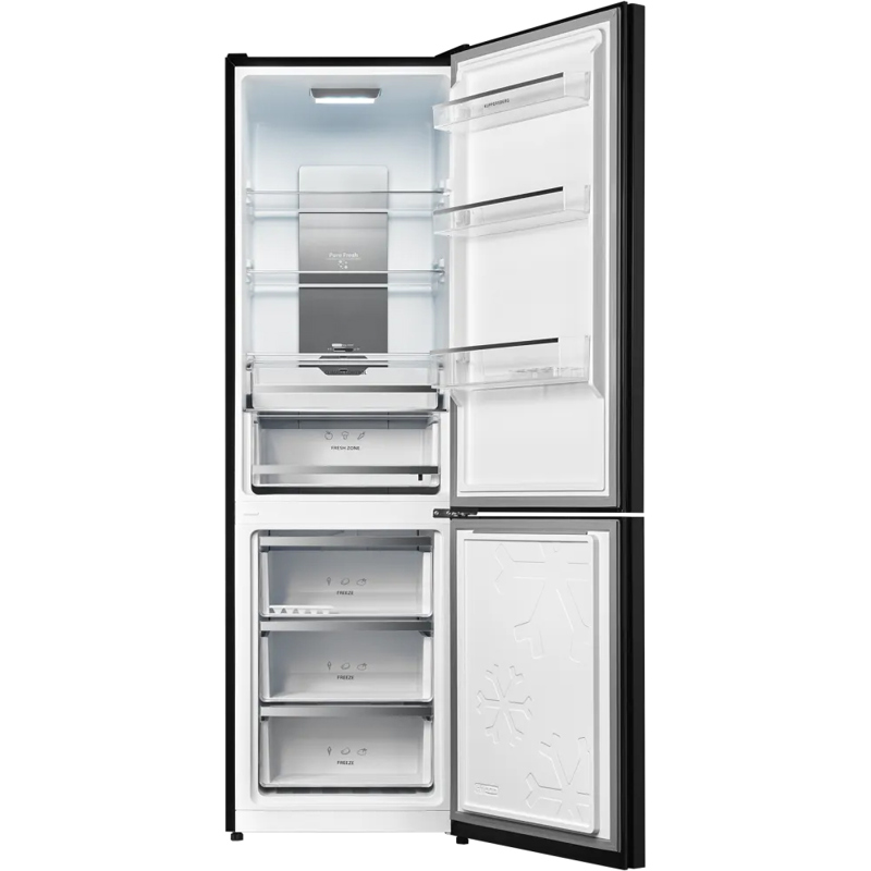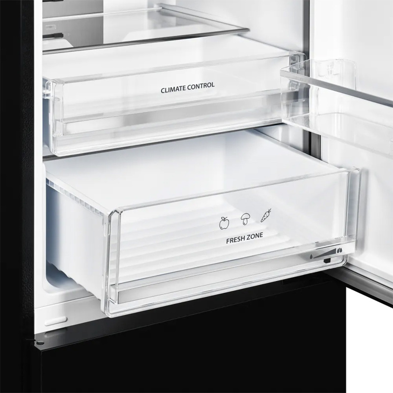 Фасад холодильника, выполненный из закаленного черного стекла, придает ему премиальный и современный вид. Внутреннее пространство равномерно освещается яркой и экономичной LED-подсветкой, которая не нагревает продукты. Продуманная организация с полками из закаленного стекла и вместительными дверными балконами делает использование холодильника максимально удобным.