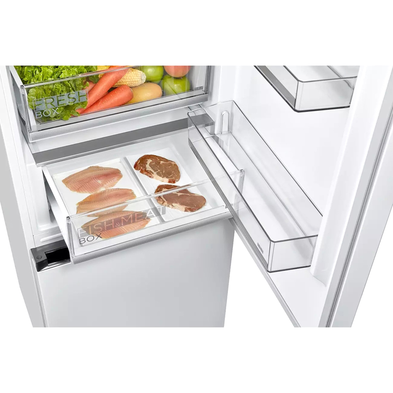 Полезный объем холодильника составляет 346 л. Холодильная камера емкостью 223 л оборудована тремя прочными стеклянными полками и двумя удобными ящиками, один из которых предназначен для зоны свежести. Морозильная камера на 123 литра включает три вместительных контейнера, где можно систематизировать продукты для длительного хранения. Дополнительные полки на дверце помогают рационально использовать каждый сантиметр пространства.