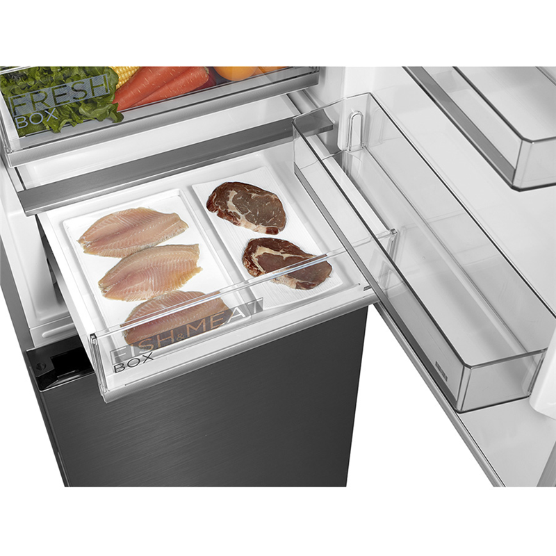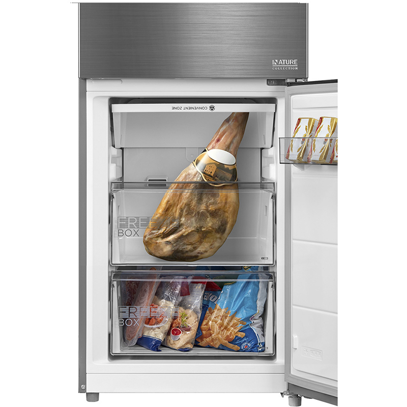 Внутреннее наполнение холодильника тщательно продумано для максимального удобства хранения. Прочные полки из закаленного стекла легко выдерживают значительный вес, а их конфигурацию можно менять. Холодильная камера объемом 223 л оборудована двумя вместительными ящиками и тремя полками на дверце. Особого внимания заслуживает дополнительная зона свежести Metal Cooling, предназначенная для деликатного хранения мяса, рыбы и сыров. Морозильная камера на 123 л с мощностью замораживания 14 кг/сутки включает три выдвижных контейнера.
