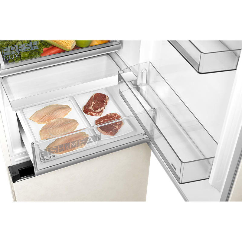Полезный объем холодильника составляет 386 л, из которых 263 л отведено под холодильную камеру, а 123 л — под морозильник, расположенный внизу. Внутреннее пространство верхнего отсека организовано с максимальным удобством: прочные полки из закаленного стекла легко выдвигаются, а наличие специальной зоны свежести подходит для длительного хранения овощей, фруктов и зелени. Морозильная камера оборудована тремя вместительными ящиками, а на дверце холодильного отделения найдется место для бутылок и небольших продуктов.