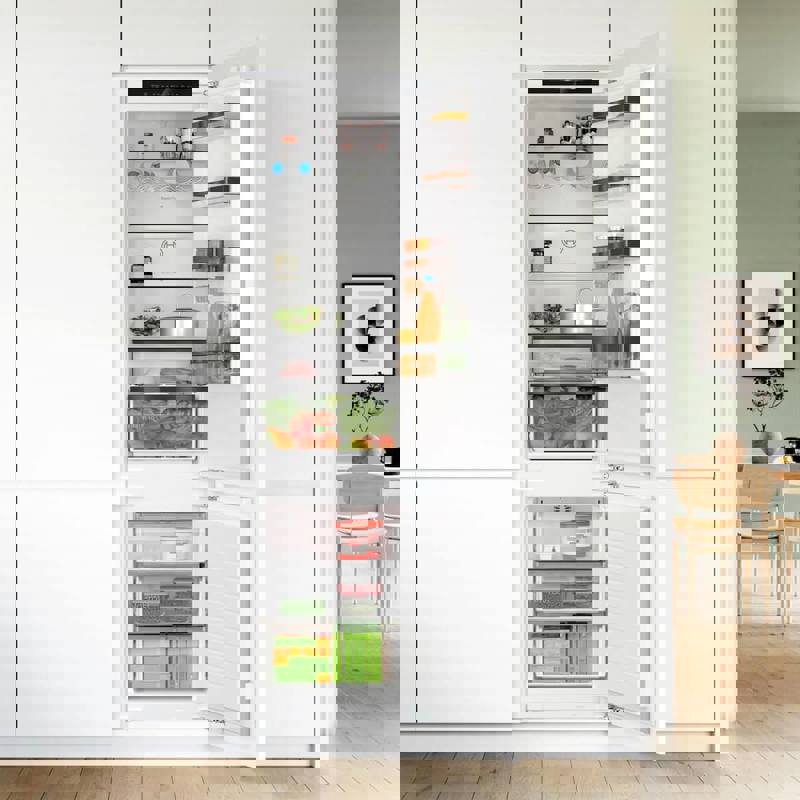 SuperFreeze быстро замораживает свежие продукты, сохраняя их вкус и питательные свойства. Перенавешиваемые двери и техника плоских шарниров обеспечивают удобство установки и эксплуатации. Внутри холодильника предусмотрены продуманные полки и отделения для различных видов продуктов, что делает хранение максимально комфортным.