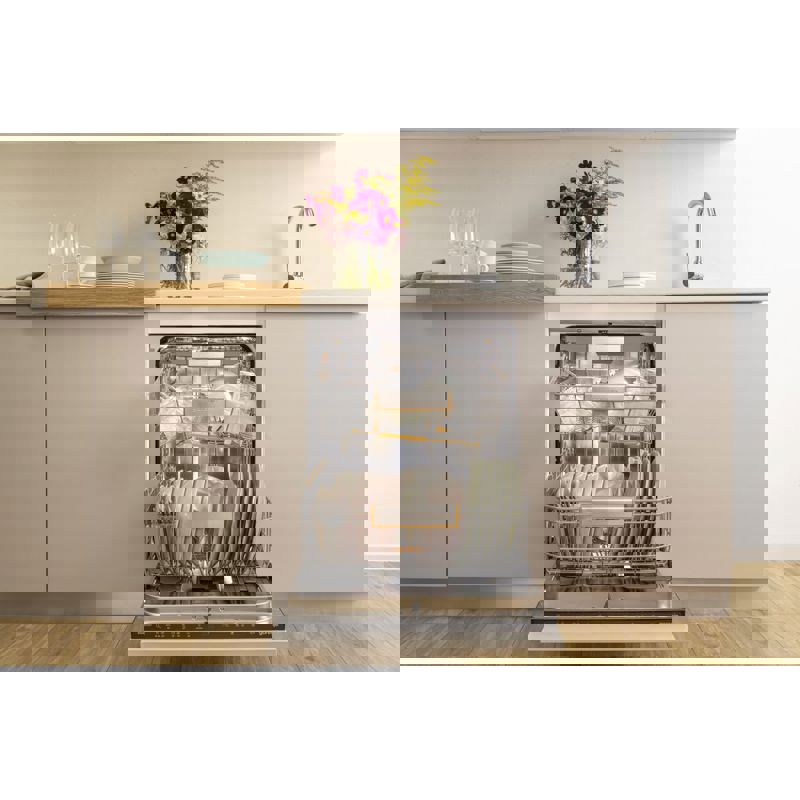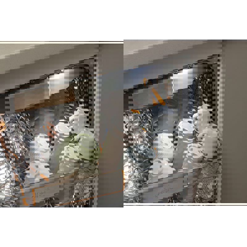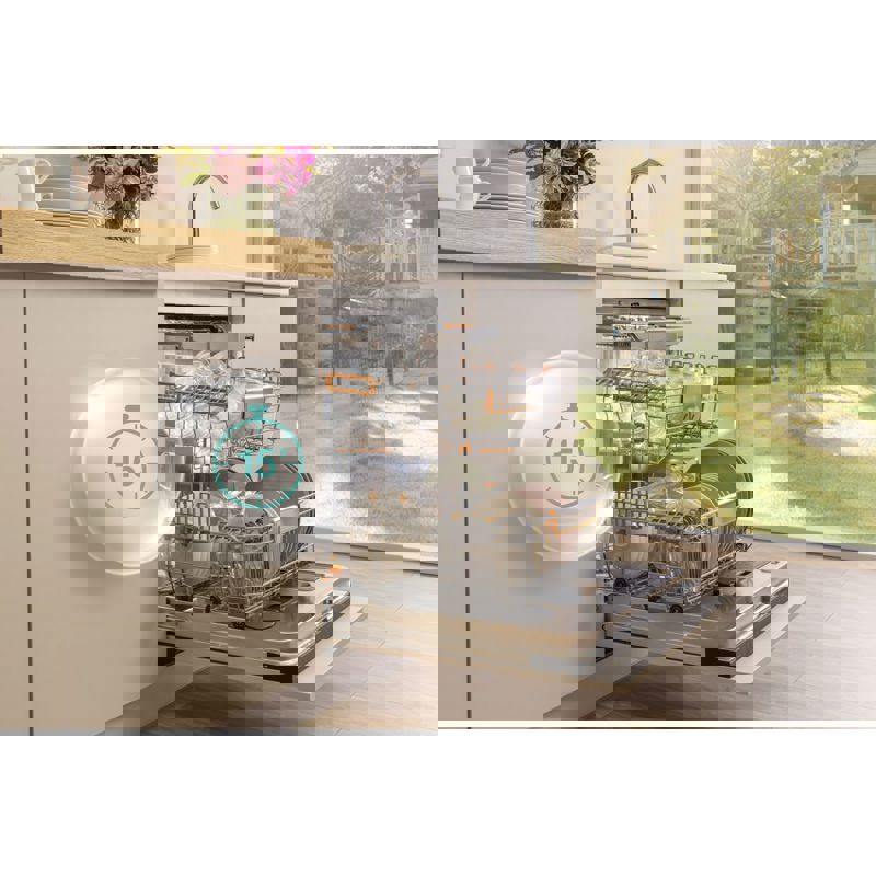 Посудомоечная машина оснащена функцией отсрочки старта, что позволяет вам планировать цикл мойки в удобное время. Благодаря Wi-Fi управлению, вы можете контролировать процесс мойки прямо со своего смартфона, что добавляет удобства в повседневное использование. Сенсорное управление делает процесс настройки простым и интуитивно понятным, позволяя легко выбирать нужные программы и режимы.
