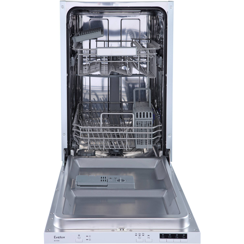 Встраиваемая посудомоечная машина EVELUX BD 4500 — узкая модель шириной всего 45 см. Это отличный выбор для небольших кухонь или тех, кто ограничен в пространстве, но хочет качественную и удобную технику. Это компактная, экономичная и простая в использовании посудомоечная машина. Она отлично подходит для небольших кухонь и обеспечивает качественную мойку и сушку посуды с минимумом шума и затрат ресурсов.