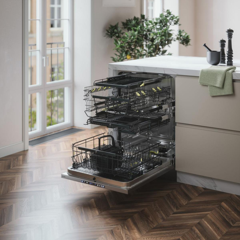 Модель имеет ширину 60 см, что обеспечивает оптимальное сочетание вместимости и компактности. Внутри расположены 4 уровня загрузки, позволяющих разместить до 17 комплектов посуды одновременно. Это делает машину особенно подходящей для больших семей или при приеме гостей. Нажимное открывание двери обеспечивает легкий доступ к посуде без лишних усилий. Также предусмотрено автоматическое открывание двери для ускорения процесса сушки и вентиляции.