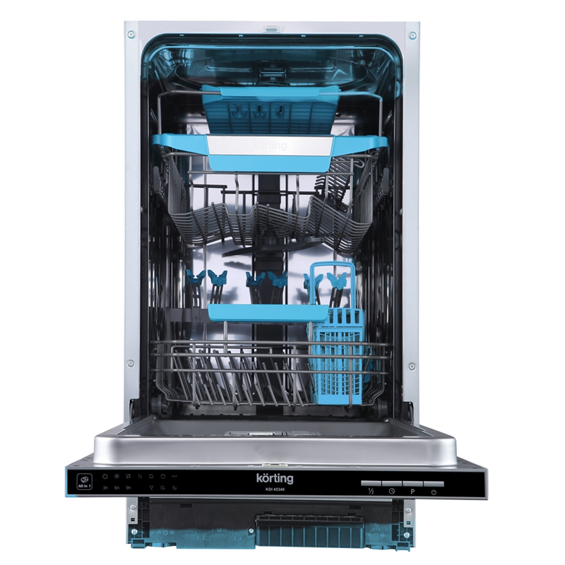 Korting KDI 45340 обладает вместительностью, позволяющей одновременно мыть до 10 комплектов посуды. Устройство оснащено несколькими корзинами и полками, которые позволяют удобно разместить посуду, столовые приборы и кухонные аксессуары, обеспечивая их надежное удержание во время мойки.