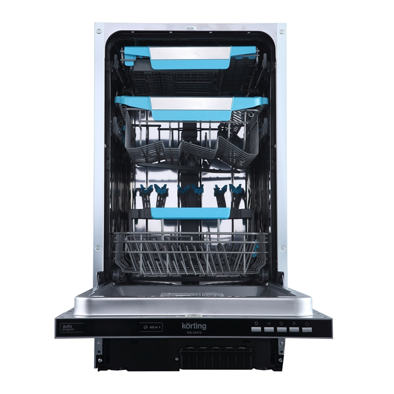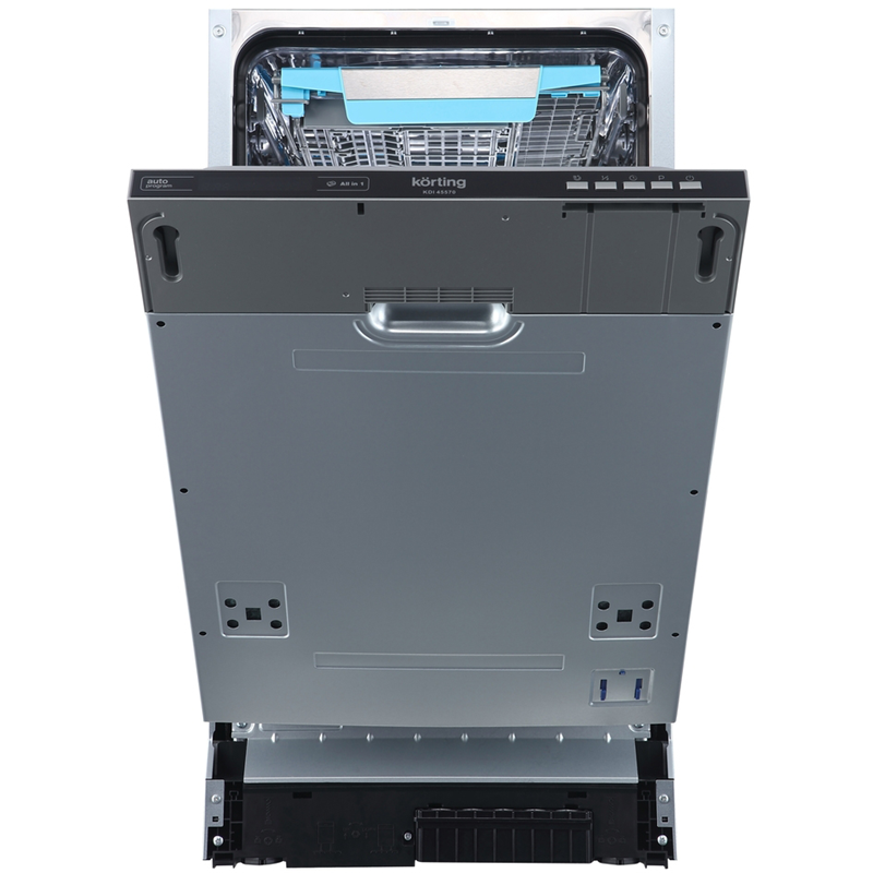 Korting KDI 45570 оснащена механическими кнопками на панели управления. В числе доступных программ — интенсивная мойка, деликатная мойка для хрупкой посуды, экономичный и быстрый режимы, а также программа «Baby Care». Это разнообразие позволяет выбрать оптимальный вариант в зависимости от типа загрязнения и материала посуды.