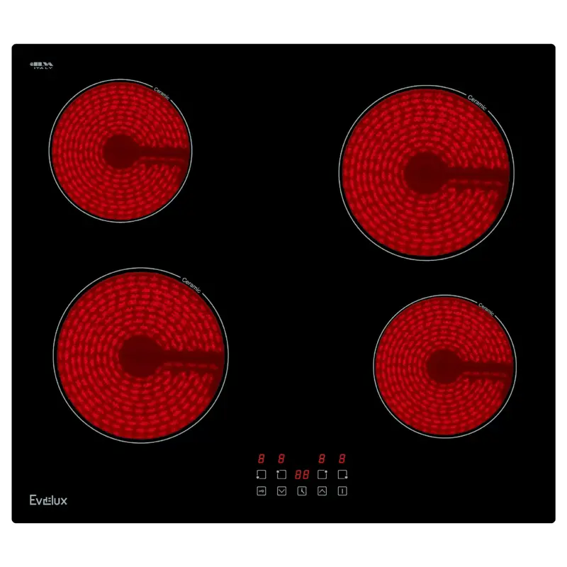 Электрическая варочная панель Evelux EV 6040 имеет четыре конфорки, при изготовлении которых используется технология быстрого нагрева Hi-Light. Модель имеет таймер выключения, что позволяет задавать продолжительность работы. Конфорка отключится автоматически после окончания установленного времени. В качестве оповещения об окончании цикла используется звуковой сигнал.
