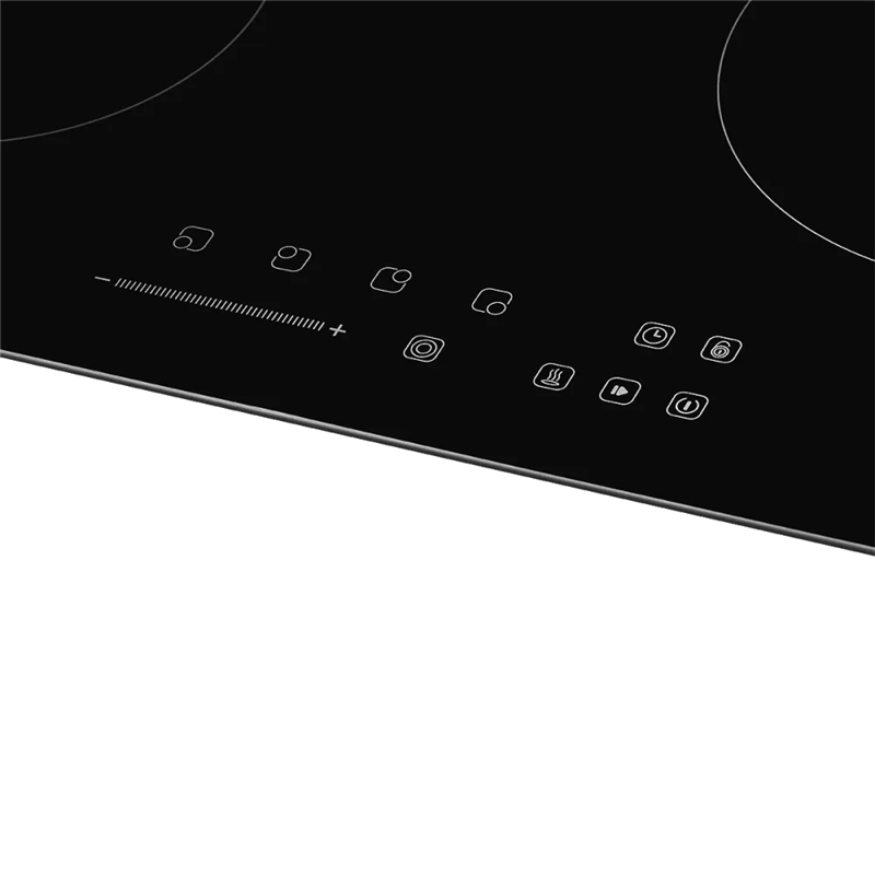 Панель оснащена инновационным сенсорным слайдером, который позволяет регулировать мощность конфорок легким движением пальца без повторных нажатий. Девять уровней мощности предоставляют точный контроль над процессом приготовления, а пять цифровых дисплеев отображают текущие настройки. Функция таймера до 99 минут с автоматическим отключением позволяет задавать время готовки, освобождая время для других задач.