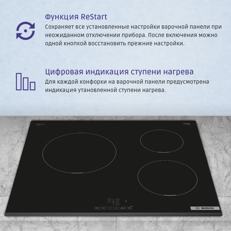 Панель обладает рядом полезных функций. Таймер позволяет задать время приготовления блюда, что облегчает процесс готовки. Функция QuickStart позволяет начать работу панели сразу после включения. ReStart дает возможность восстановить предыдущие настройки после случайного отключения. PowerBoost увеличивает мощность нагрева для ускорения процесса приготовления, а PowerManagement помогает контролировать энергопотребление.