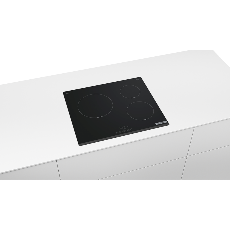 Индукционная варочная панель Bosch PUC631BB5E - это трехконфорочное устройство, выполненное в черном цвете. Варочная поверхность изготовлена из стеклокерамики, что придает ей элегантный внешний вид и упрощает уход. Управление панелью осуществляется с помощью сенсоров и системы TouchSelect, что делает процесс взаимодействия с устройством простым и понятным.