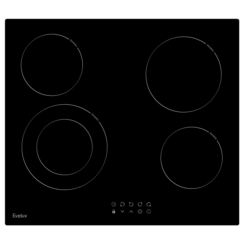 Зоны нагрева Evelux оборудованы современными нагревательными элементами Hi-light. Конфорка достигает установленной рабочей температуры буквально за считанные секунды, позволяет плавно регулировать мощность.
