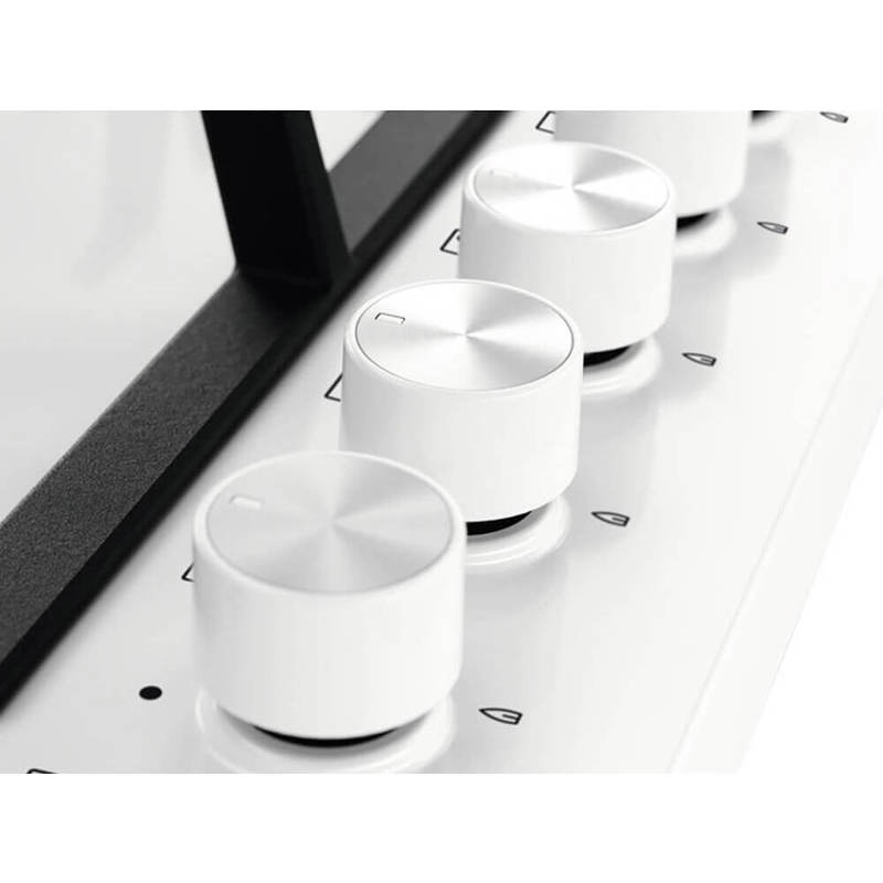 Панель исполнена в элегантном белом цвете, который легко впишется в современную или классическую кухню. Поверхность из прочной нержавеющей стали не только выглядит стильно, но и отличается долговечностью и простотой в уходе. Дизайнерской изюминкой модели является скошенный край, который придает устройству визуальную легкость и изысканность. Вся фурнитура, включая поворотные переключатели, выполнена в единой цветовой гамме, создавая гармоничный и целостный образ.