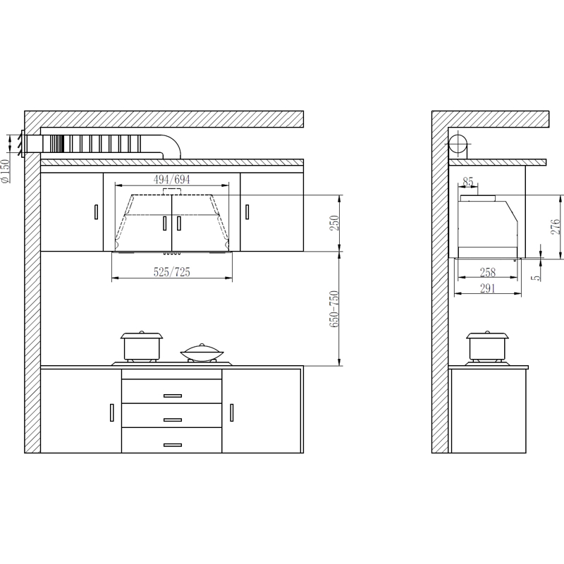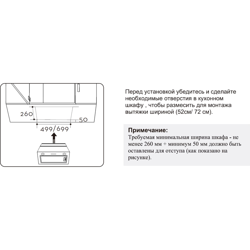 Данная модель предназначена для полного встраивания в стандартный кухонный шкаф шириной 49,9 см, что позволяет ей органично сливаться с мебелью. Для удобства монтажа и подключения к вентиляционной системе предусмотрен декоративный короб и клапан, который предотвращает обратную тягу из воздуховода. Минимальная высота установки над газовой плитой составляет 75 см, что гарантирует соблюдение норм безопасности и оптимальную эффективность работы прибора.