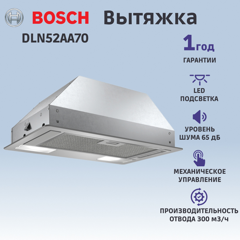 Благодаря современному дизайну и функциональности, встраиваемая вытяжка Bosch DLN52AA70 станет отличным дополнением любой кухни, обеспечивая чистоту воздуха и уютную атмосферу во время готовки.