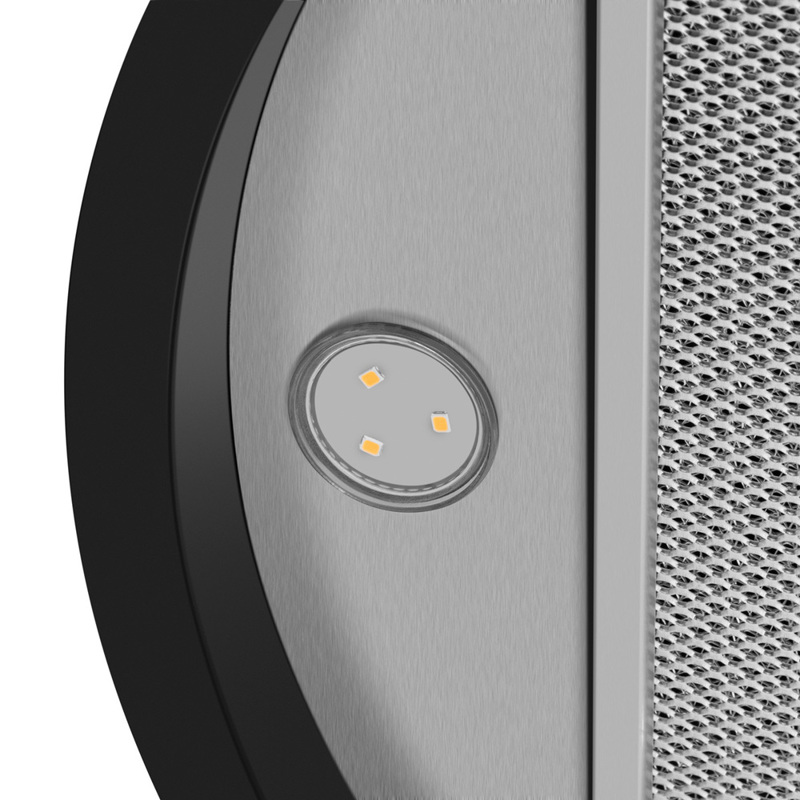 Корпус вытяжки изготовлен из нержавеющей стали INOX, которая отличается высокой прочностью, долговечностью, устойчивостью к коррозии и лёгкостью в уходе.